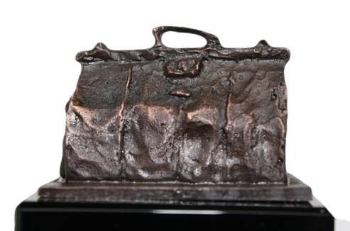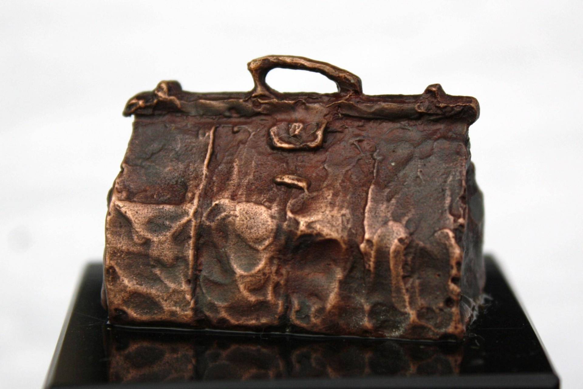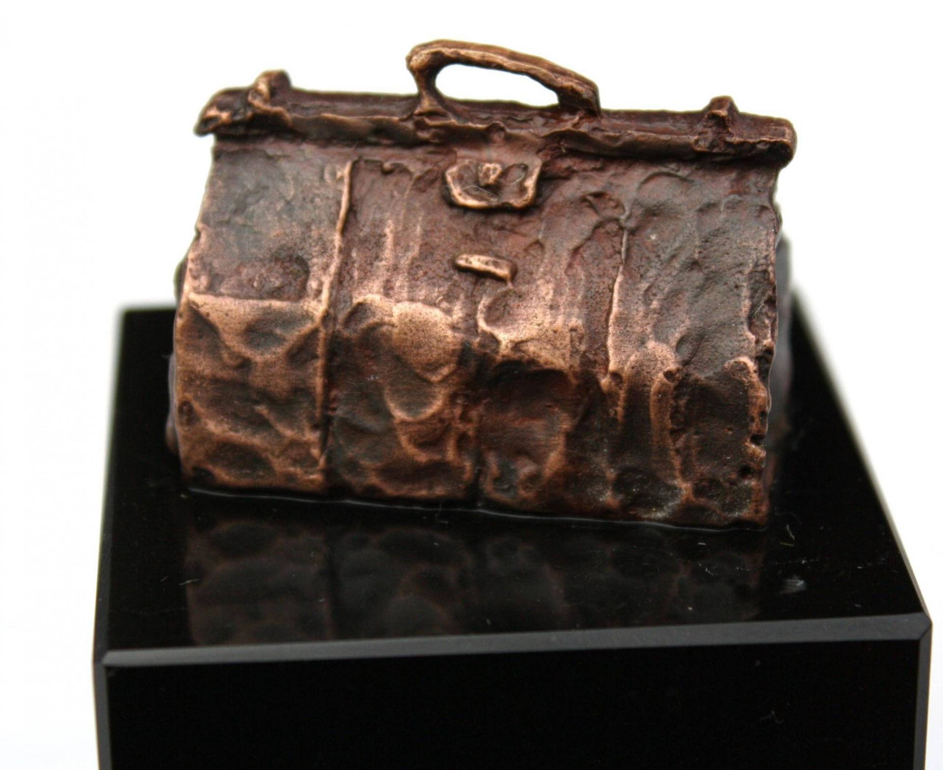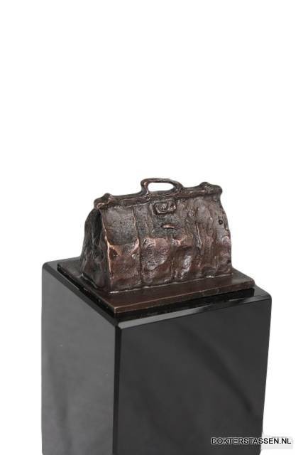 Diese Figur einer Arzttasche auf schwarzem Sockel ist eine Miniatur-Arzttasche aus bronziertem Zinn. Handgefertigt von Martin van den Houdt, Höhe 16 cm. Ideales Geschenk für Hausärzte bei Studienabschluss oder Promotion. Klassisch und hochwertig.