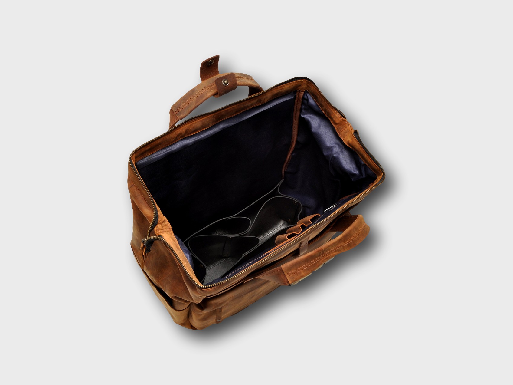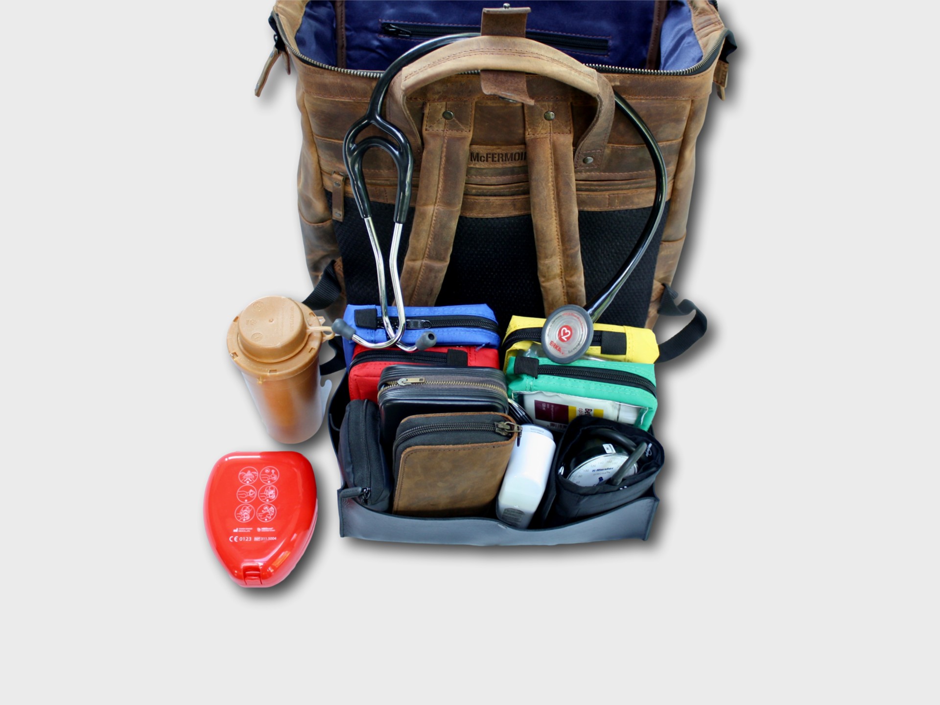 Die mitgelieferte Facheinteilung aus Leder (ca. 28 x 15 x 10 cm) bietet ausreichend Platz für alle erforderlichen medizinischen Instrumente und ist herausnehmbar für flexible Nutzung. Neben der Facheinteilung bleibt ausreichend zusätzlicher Platz für andere Utensilien wie Dokumentation, persönliche Sachen oder einen Laptop bis 13 Zoll.