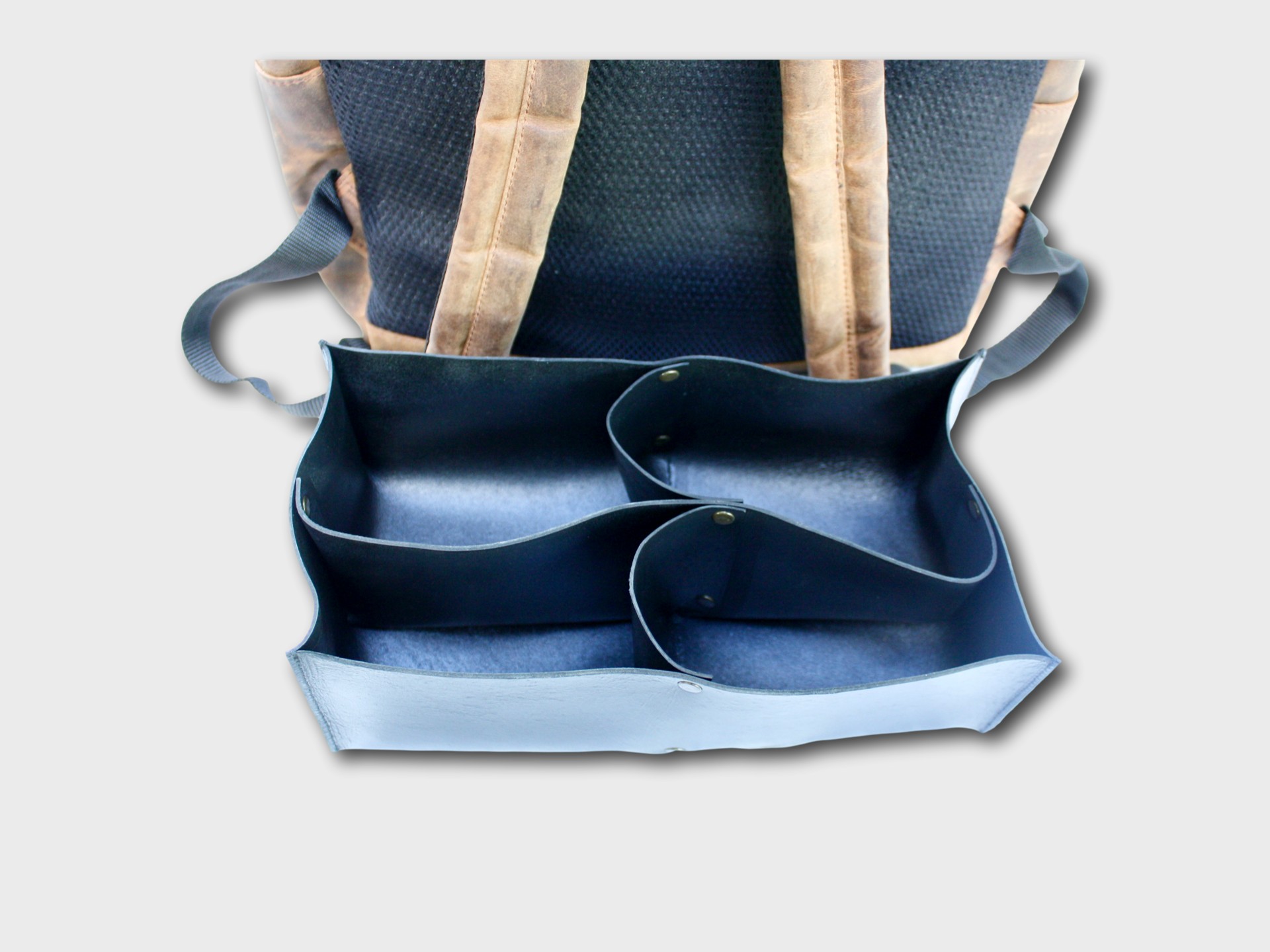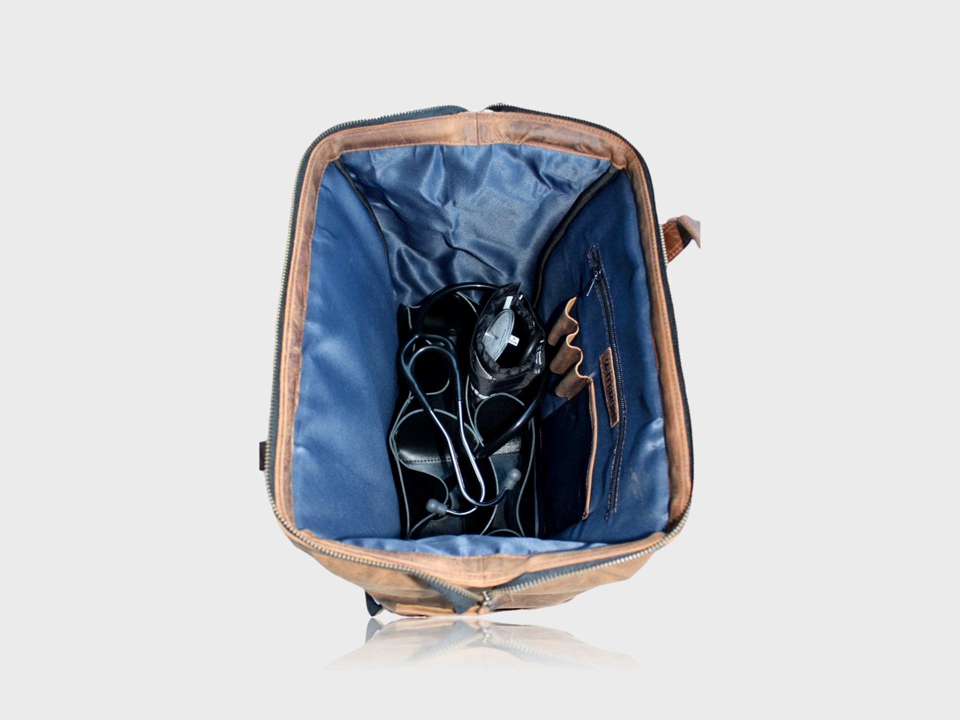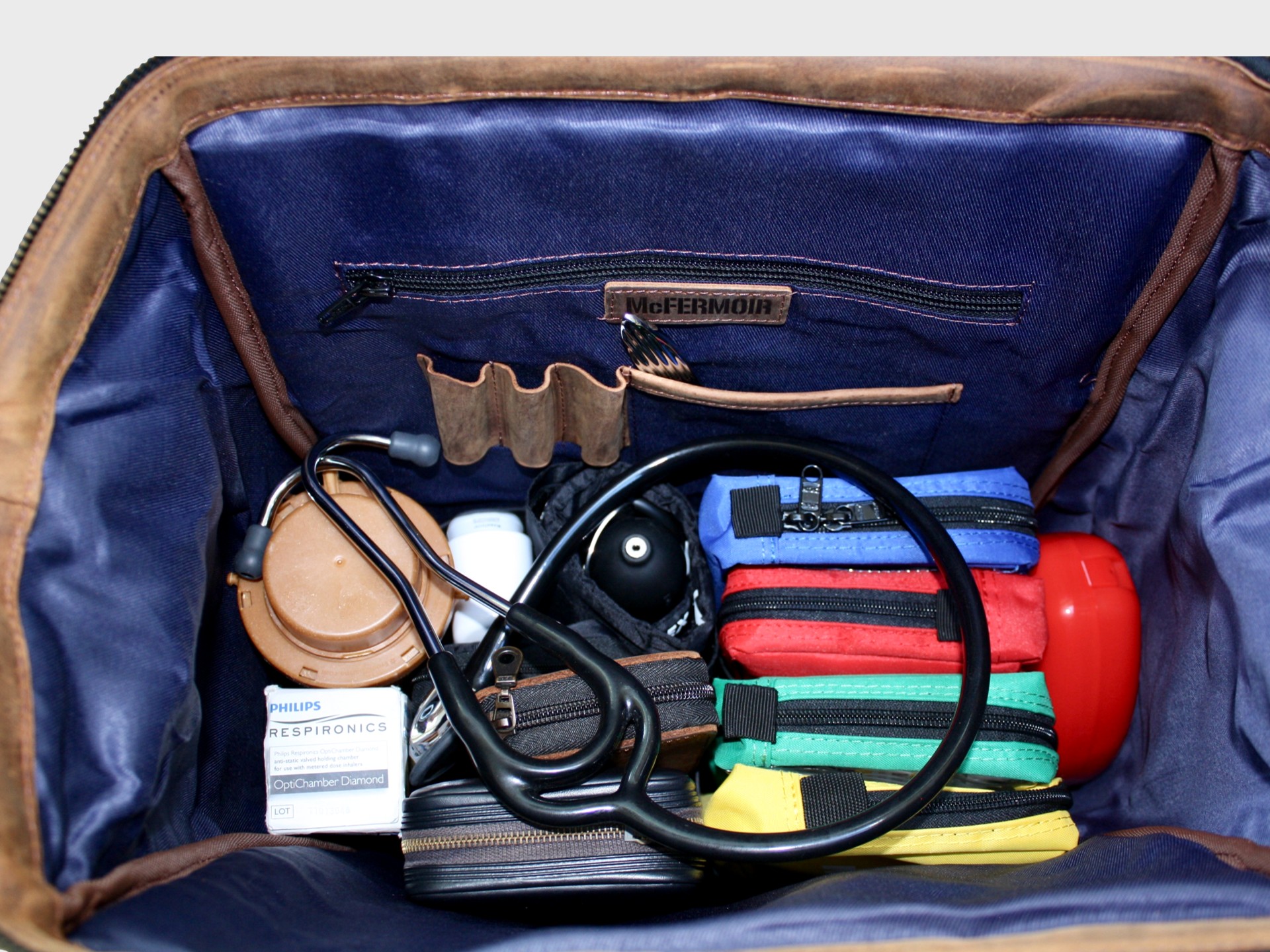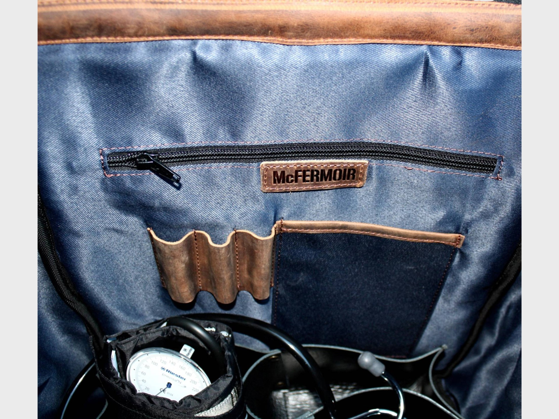 Die mitgelieferte Facheinteilung aus Leder (ca. 28 x 15 x 10 cm) bietet ausreichend Platz für alle erforderlichen medizinischen Instrumente und ist herausnehmbar für flexible Nutzung. Neben der Facheinteilung bleibt ausreichend zusätzlicher Platz für andere Utensilien wie Dokumentation, persönliche Sachen oder einen Laptop bis 13 Zoll.
