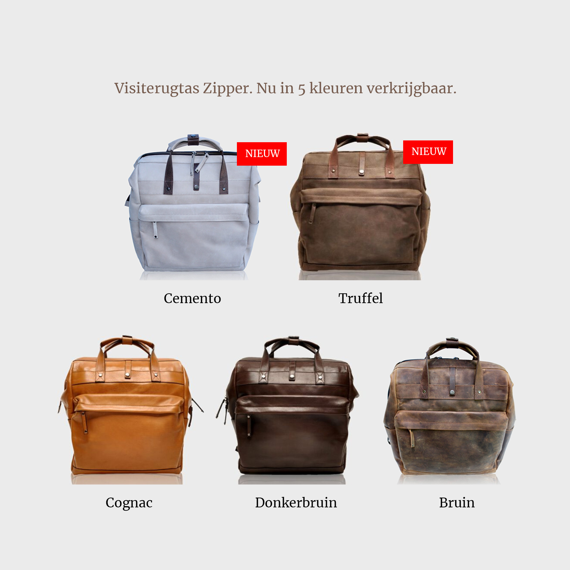Der Visiten-Rucksack Zipper ist erhältlich in: Braun, Cognac, Dunkelbraun und Cemento